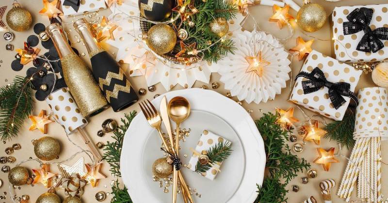 В новогоднюю ночь принято проводить много времени за столом. Именно поэтому следует очень тщательно отнестись к составлению меню. В идеале украсить его праздничной скатертью, в которой преобладающими цветами будут белый и золотистый. Салфетки должны быть в тон.