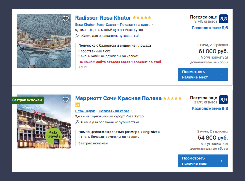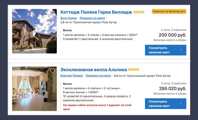 Понятно, что в эти три дня нужно где-то ночевать, причём делать это лучше на курорте, чтобы не тратить время на подъём. Отели на "Розе Хутор" удивляют разнообразием и, конечно, роскошью. Семьёй на три дня можно, например, снять небольшую виллу. Стоить это будет 300 000 рублей. Есть варианты и подешевле — коттедж за 200 000.