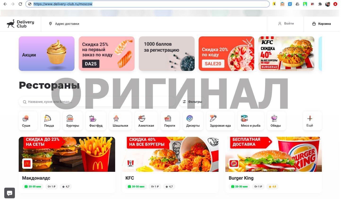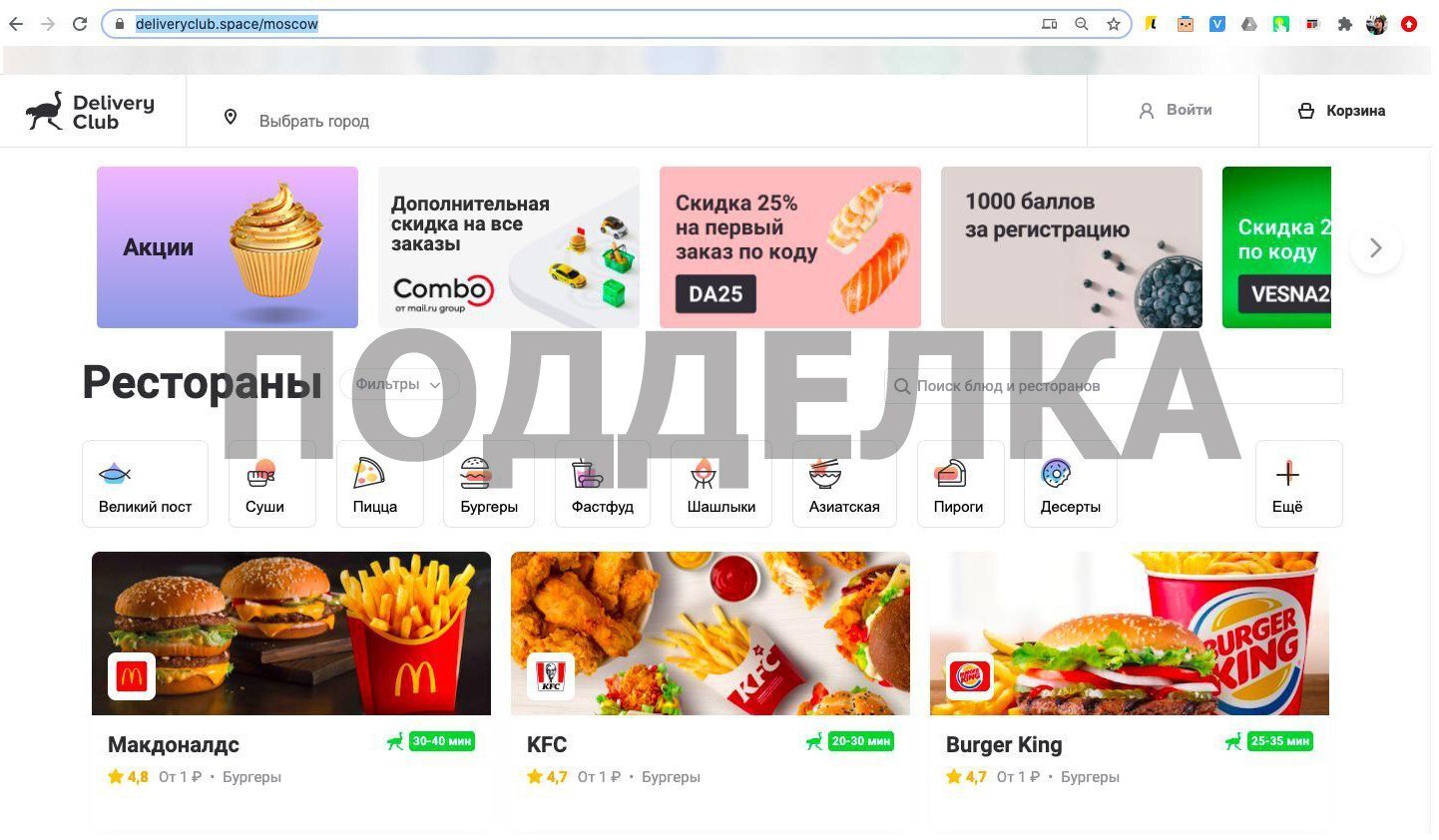 Мошенники не могли обойти стороной лакомый во всех смыслах сегмент рынка и отметились и тут. Самоизоляция подтолкнула злоумышленников к созданию сайтов-двойников известных сервисов доставки еды. Только у Delivery Club по разным подсчетам появилось около 90 лже-сайтов. А если брать других игроков данного рынка «Сбермаркет», «Яндекс. Еду», «Утконос», «ВкусВилл» и «Перекресток», то общее количество фишинговых сайтов исчисляется сотнями.