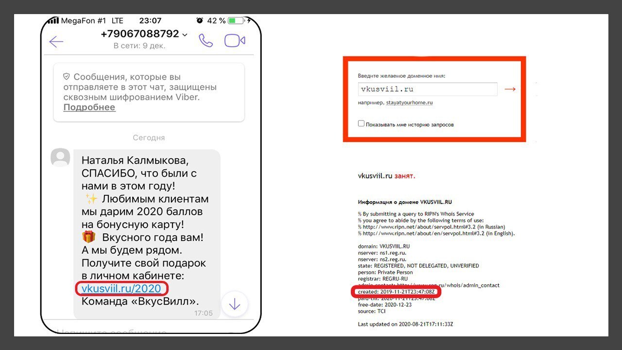 Именитый сайт. При переходе по ссылке или баннеру сразу обращайте внимание на адресную строку. Незаметная подмена одной буквы и вы уже находитесь на поддельном сайте, который был зарегистрирован недавно, специально для посетителей-простачков. В примере выше фейковая ссылка называется http://vkusviil.ru/. Тогда как оригинальная — https://vkusvill.ru/. Похоже, но не идентично.