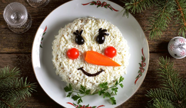 Сразу перед подачей блюду можно придать внешний вид снеговика. Из маслин оформить глазки. Из кончика моркови сделать нос, из двух кружочков – румянец на щечках, а из полукруглого кусочка — рот. Ведерко в виде трапеции вырезать из листа нори.