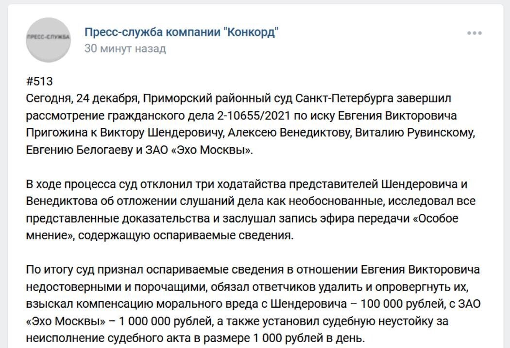 24 декабря в Приморском районном суде Санкт-Петербурга завершилось рассмотрение дела по иску Евгения Пригожина к ЗАО «Эхо Москвы», Виктору Шендеровичу, Алексею Венедиктову, Евгению Белогаеву и Виталию Рувинскому.
