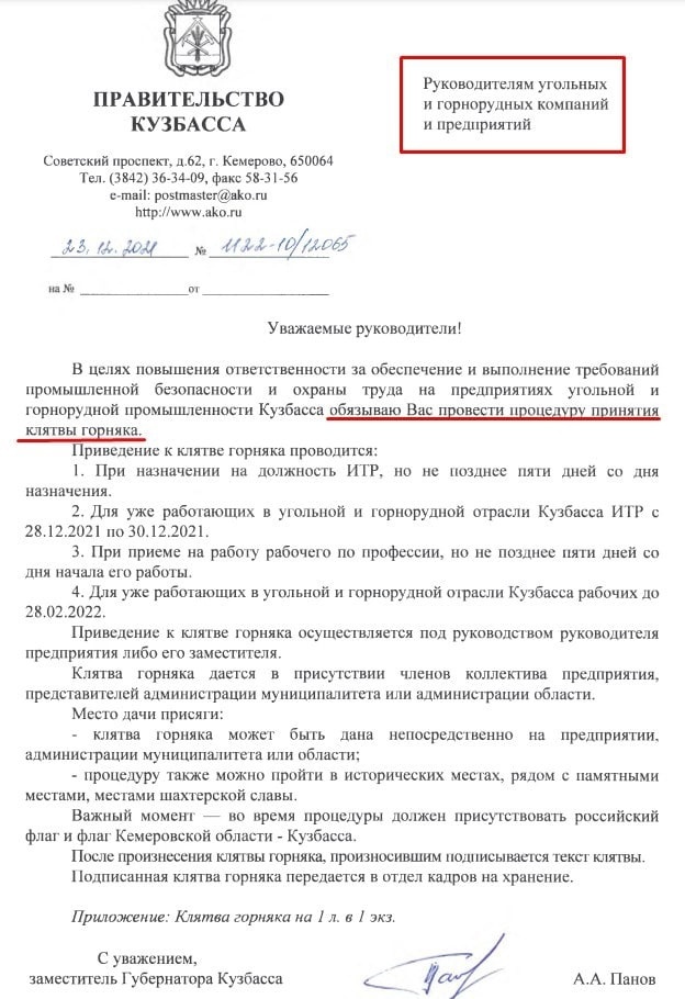 Замгубернатора Кузбасса Андрей Панов распорядился, чтобы все угольные и горнорудные предприятия региона провели процедуру «присяги» шахтёров. Документы попали в Сеть.