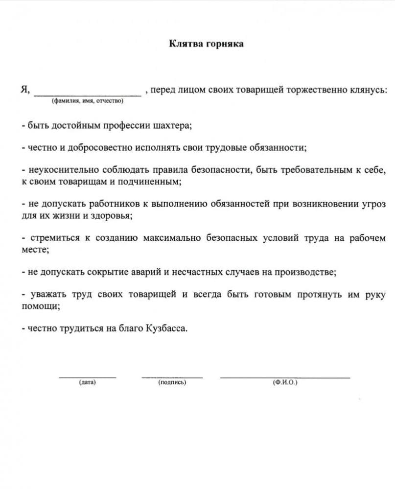 23 декабря власти Кузбасса ввели обязательную «клятву горняка» для шахтёров. Эта процедура расценивается как дополнительная мера повышения личной ответственности за промбезопасность. Согласно документу, клясться будут не позднее 5 дней после вступления в должность. Все те, кто уже трудится в отрасли, должны будут «присягнут» до 28 февраля 2022 года.