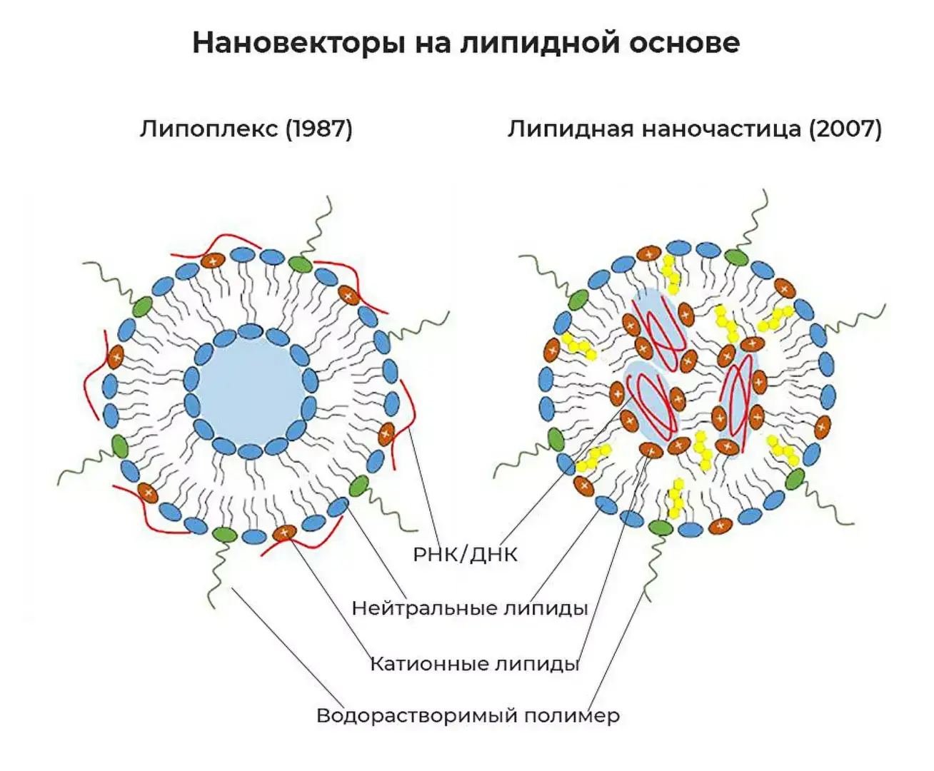 В 1985 году американский ученый Фил Фелгнер (Phil Felgner) предложил доставлять нуклеиновые кислоты в клетку с помощью катионных липидов. Идея заключалась в том, чтобы упаковать ДНК или РНК в липосомы — заполненные жидкостью сферические частицы диаметром меньше 100 нанометров. Их оболочка состоит из гидрофобных органических молекул — липидов. Положительно заряженные катионные липиды взаимодействуют с отрицательно заряженной цепью ДНК или РНК и сжимают ее в компактную структуру. А клеточная мембрана захватывает наночастицы из окружающей среды.