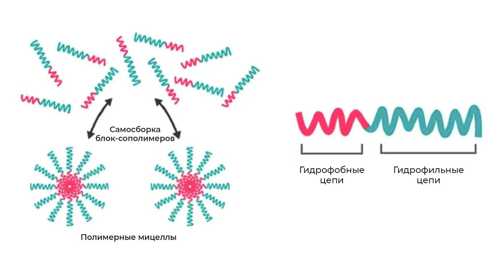 Для решения этой проблемы Александр Кабанов и его коллеги еще в советские годы стали использовать блок-сополимеры, которые спонтанно собираются в наночастицы с внутренней стороной из гидрофобных цепей и внешней — из гидрофильных. Гидрофобные участки захватывают молекулы, которые плохо растворимы. Эти наночастицы называют полимерными мицеллами.