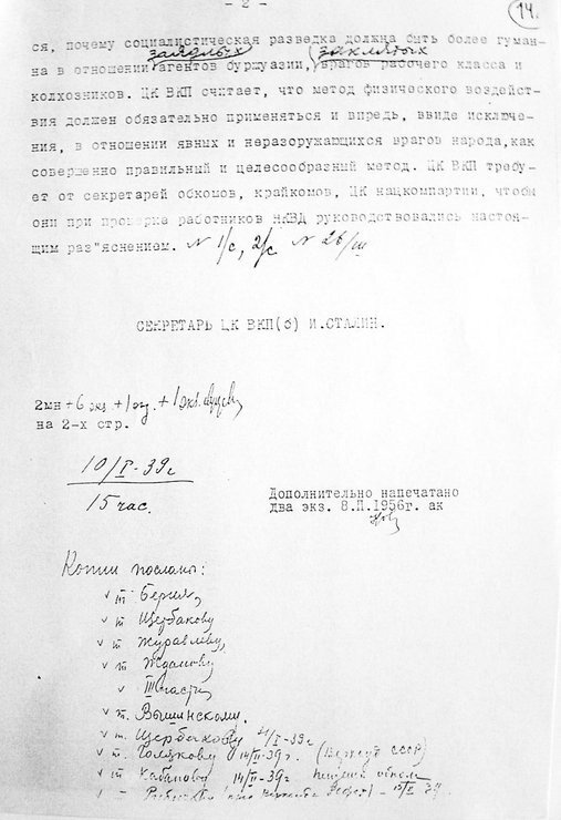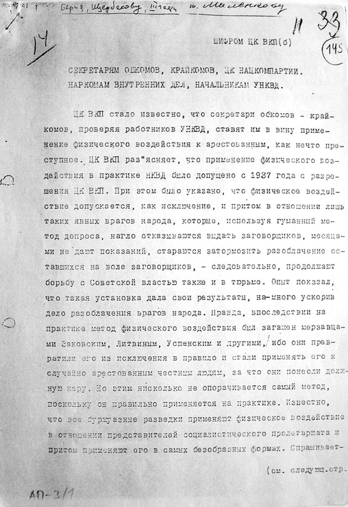 Официально пытки к арестованным были разрешены в 1937 с санкции ЦК ВКП(б). Когда в 1939 году местные партийные органы требовали отстранять и отдавать под суд сотрудников НКВД, которые участвовали в пытках, Сталин направил партийным органам и органам НКВД телеграмму, в которой дал теоретическое обоснование допустимости пыток как исключительного средства в отношении врагов народа.