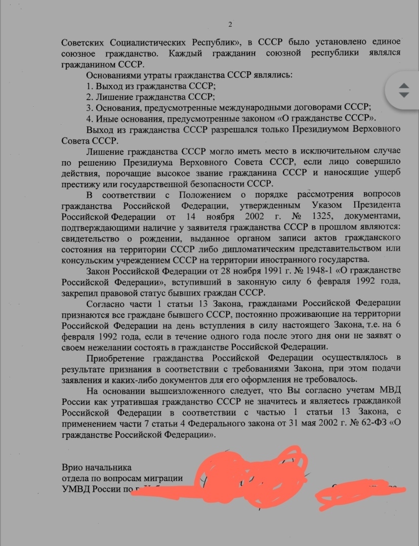 Из этого вывод такой: " Процедуры выхода из гражданства не было, а это означает, что я являюсь гражданином СССР ". Я Иностранный гражданин на территории РФ. Ни каких оснований считать меня гражданином РФ не имеет право миграционная служба, так как я проживаю на своей территории со дня своего рождения. О чем свидетельствует выписка из домовой книги. Вот так-то!!!