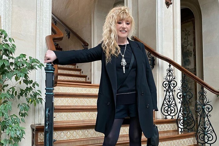 В замке Примадонна покрасовалась в черном кожаном платье с открытыми плечами и колготках-чулках. Сапожки и митенки дополнили ее образ. Наряд был коротким, поэтому она показала стройные ножки.