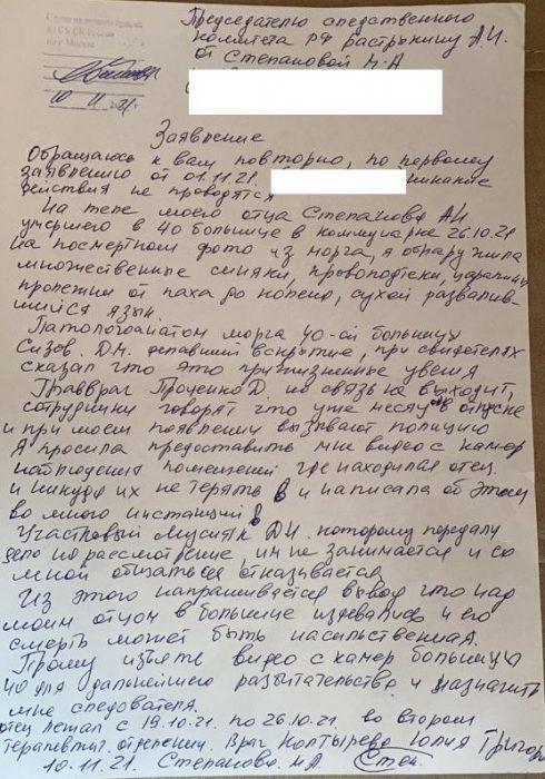 «7 октября у отца остановилось сердце. В предоставленной больницей № 40 медкарте нет фамилий врачей, делавших назначения. Одной из причин смерти нам назвали сепсис. В морге папу было не узнать — синий нос, покосившиеся губы, нижняя губа была вдавлена, все лицо было отекшим», - сообщает дочь покойного.