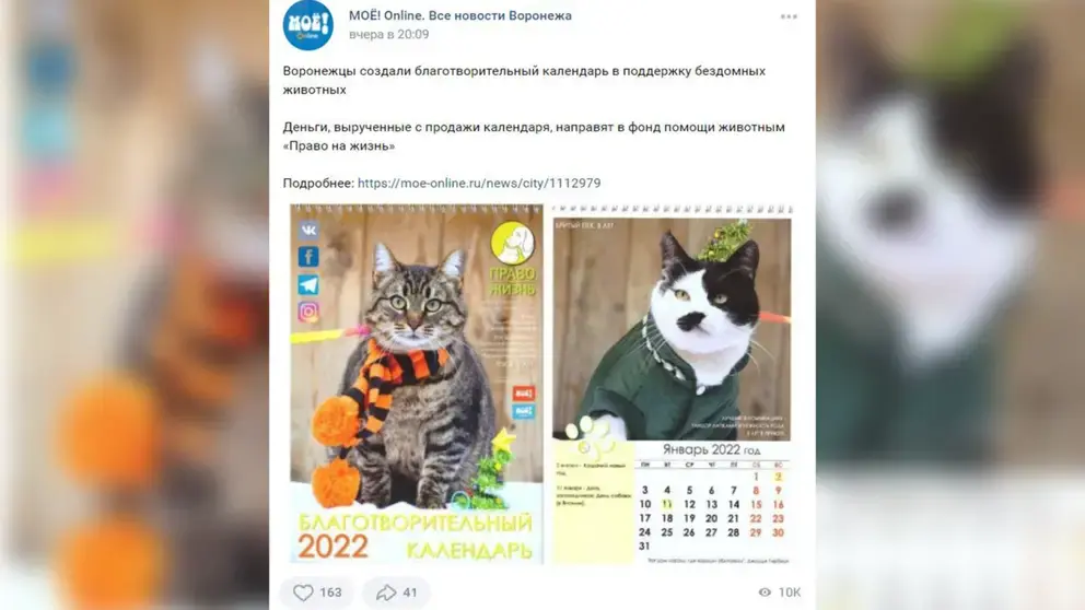Источник https://riafan.ru/1577724-voronezhskie-volontery-sozdali-blagotvoritelnyi-kalendar-v-podderzhku-bezdomnyh-zhivotnyh