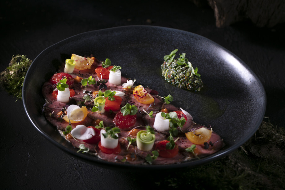 Сборка блюда: выложить на дно тарелки соус грибиш с тунцом и печенью трески. Поверх соуса выложить тонкие слайсы запеченного ростбифа. Украсить запеченным болгарским перцем, половинками томатов черри, слайсами маринованного кабачка и микрозеленью.