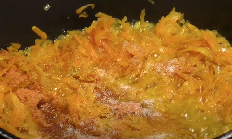 Капусту мелко шинкуем, нарезаем небольшими кубиками лук, морковь просто натираем на терке. Теперь разогреваем на сковороде растительное масло и по очереди обжариваем все овощи: доводим лук до полупрозрачности, затем добавляем к нему морковь, кладем томатную пасту, перчим, солим и перемешиваем.
