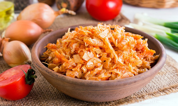 Ингредиенты: 1,5 килограмма молодой капусты, 250 граммов лука, 300 граммов моркови, 50 граммов томатной пасты, 5 граммов сахара, 15 граммов соли, 5 граммов черного перца, 2 лавровых листика, 150 миллилитров растительного масла.
