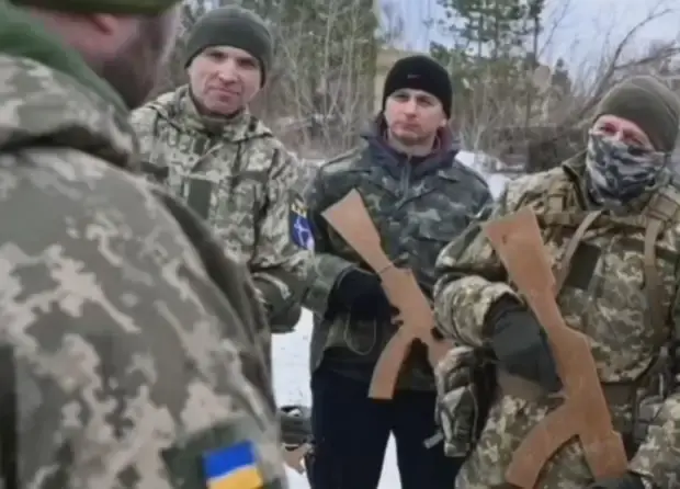 Действительно, по информации, опубликованной в социальных сетях и на украинских форумах, помимо деревянного оружия войскам территориальной обороны приходилось ещё и имитировать звуки стрельбы. Представляете, встречаются два военнослужащих в "схватке", и гарный хлопец Петро наводит деревянный автомат на "москаля" Ивана и имитирует автоматную очередь. Иван падает... От смеха.