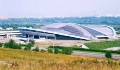 Здание велотрека имеет в плане форму эллипса. Его кровля – стальная мембрана, толщиной 4 мм, площадью 17,5 тыс. кв.м. К этому надо добавить не имеющее аналогов лиственничное покрытие трека и огромный запас чистого воздуха под куполом, постоянно обновляемый специальными установками. На трибунах 6000 мест для зрителей.