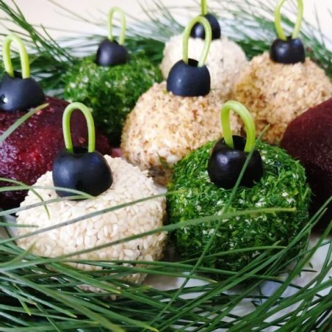 7. Обваливаем в ореховой крошке, из половинок оливок делаем «крепления», из зелени — петельки.