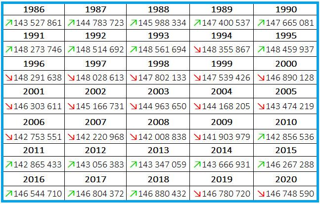 Данные последних лет говорят об ускорение процесса падения численности страны. Некоторое «смягчение» падения численности за счёт миграции уже не компенсирует потери людского ресурса, о котором наши руководители любят говорить, что это самая главная задача власти - «народосбережение» (послание Президента РФ Федеральному Собранию).