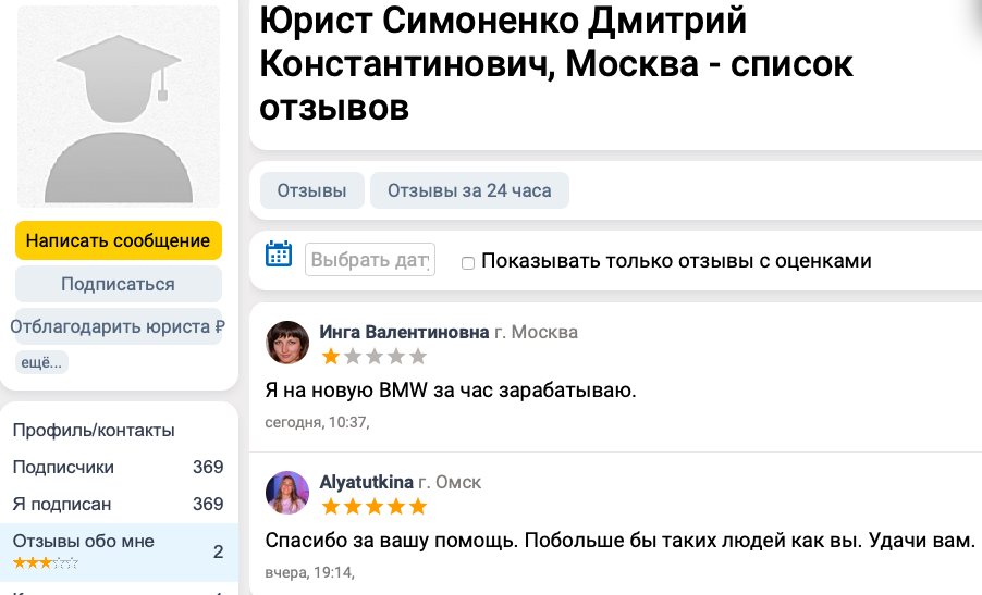 На сайте он два дня больше, чем Кристина. Успел дать за всё это время лишь одну консультацию. Зато какие пишет юридические статьи! Судите сами, господа: