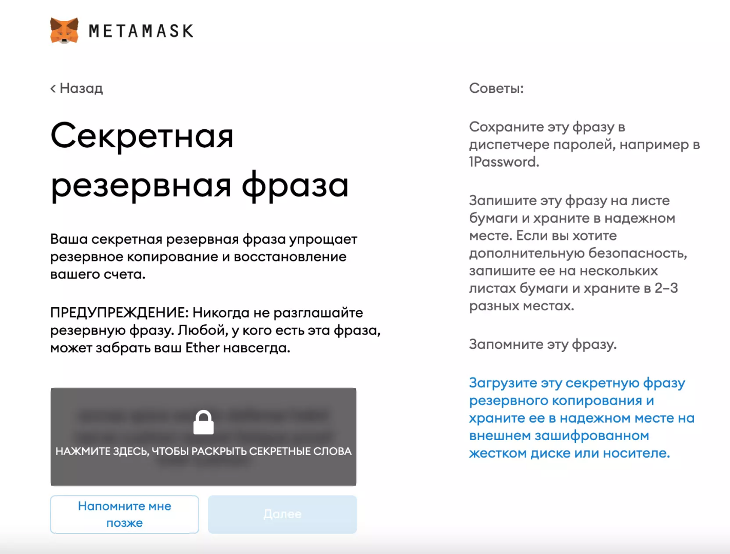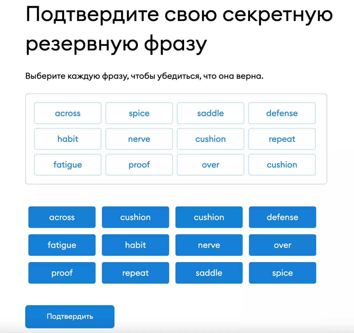 После этого МетаМаск попросит вас повторить фразу, чтобы убедиться в том, что вы сохранили её. Выберите слова в правильной последовательности