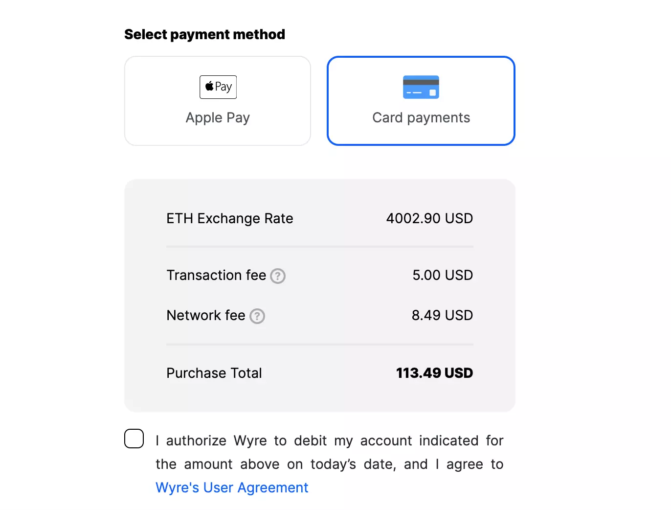 Вторым вариантом пополнения, является покупка Ethereum у встроенного в кошелек сервиса. Такие операции проводит платформа Wire Widget. Это удобный вариант, единственный минус которого — это высокий курс продажи. Например при написании этой статьи курс платформы за 1 ETH составил 4 002,24 USD. При этом биржевая стоимость 1 ETH находилась на уровне 3 751 USD.