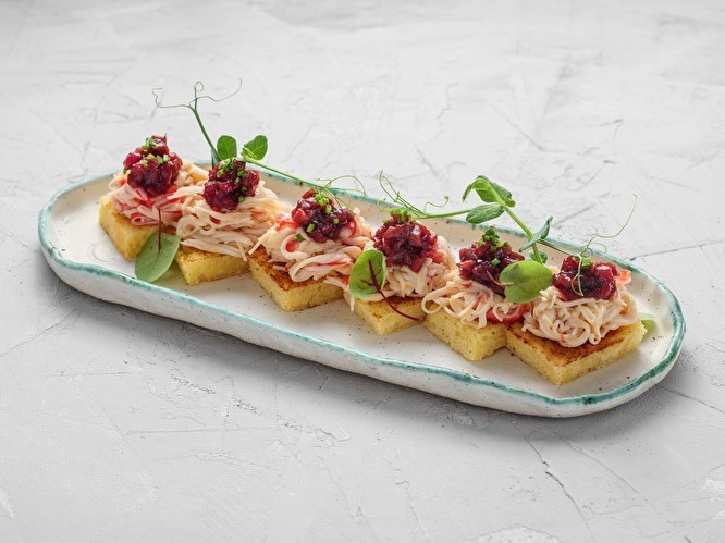 Шеф-повар Роман упростил для нас ресторанный рецепт закуски и заменил говяжий тартар «крабовым» мясом. Бриошь для закуски шеф советует купить в ресторане или в хорошей пекарне, а не в продуктовом магазине. Можно в принципе взять обычный светлый хлеб для тостов — тогда стоимость блюда будет еще меньше. «Снежного краба» можно взять как в виде мяса, как и в виде крабовых палочек — их легко разобрать на волокна.