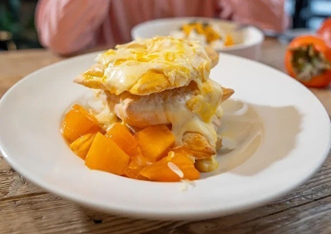 Выкладываем выпеченный квадрат слоеного теста, поливаем кремом, и так повторяем до трех слоев теста, рядом выкладываем очищенную от кожуры хурму и посыпаем миндальными лепестками.
