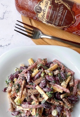 Салат с консервированной фасолью, колбасой, сыром и сухариками - это отличный вариант сытного салата, который подойдет не только на каждый день, но и для праздника.