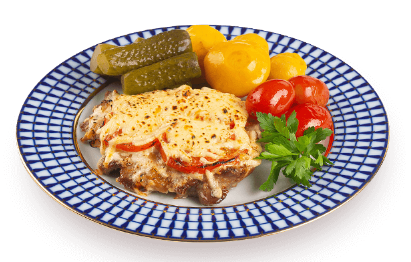При подаче украсьте зеленью, а в качестве гарнира используйте томаты черри, маринованные патиссоны и соленые огурчики.