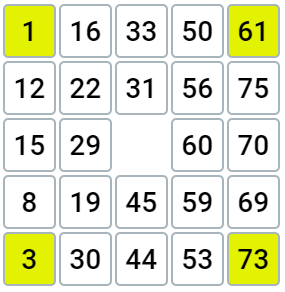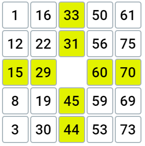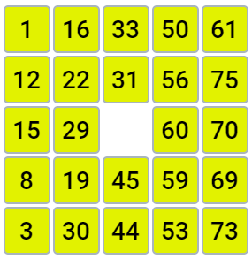 Бинго 75Каждый лотерейный билет «Бинго 75» имеет одно игровое поле (таблицу), в котором 24 числа, варьирующиеся от 1-го до 75-ти. Каждый такой билет имеет возможность выиграть до 3-х раз.