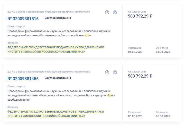Общественная служба новостей сообщала, что, согласно данным портала госзакупок, Институт философии Российской академии наук (РАН) направил более 742 тысяч рублей на исследование «Является ли злом существование ада».