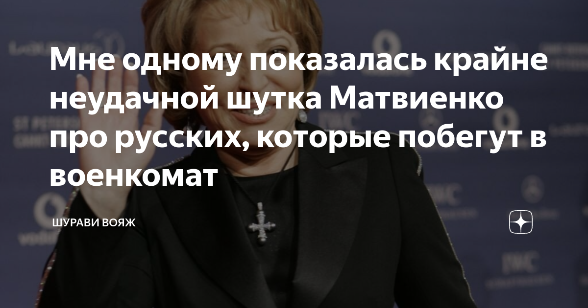 Источник: https://zen.yandex.ru/media/id/5e721d0763a0527b2b467968/mne-odnomu-pokazalas-kraine-neudachnoi-shutka-matvienko-pro-russkih-kotorye-pobegut-v-voenkomat-61d2aeb68171a2241ea87c12