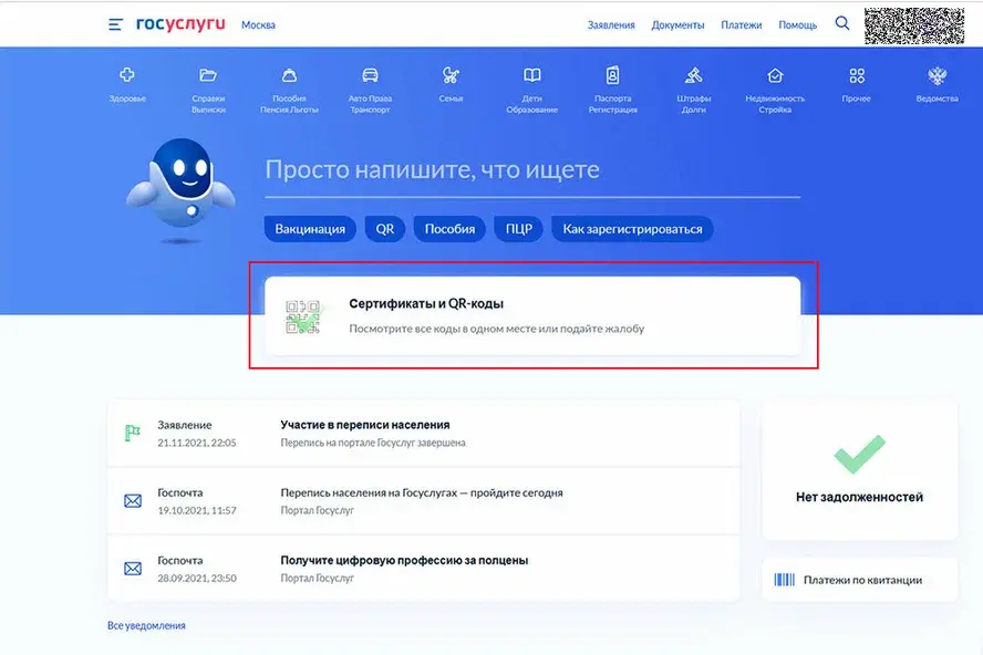 Найти свой QR-код на госуслугах очень просто - достаточно перейти в раздел "Сертификаты и QR-коды" с главной страницы Госуслуг.