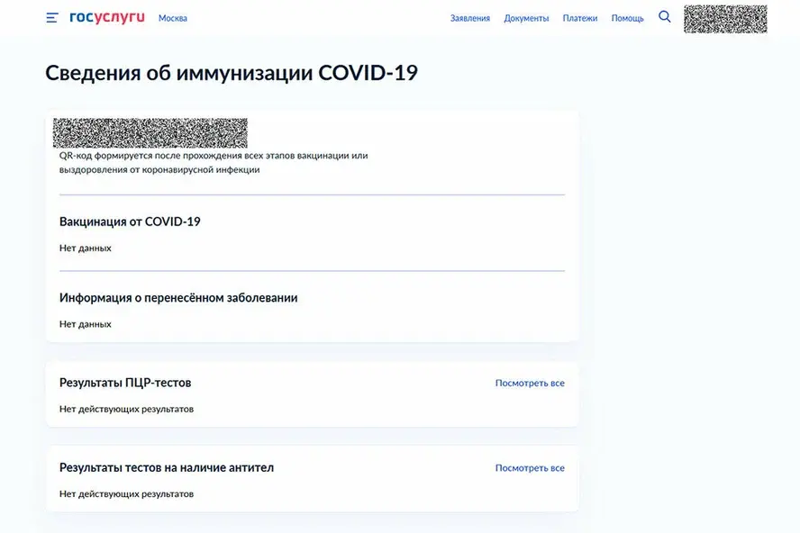 После чего откроется страница со сведениями о вакцинации, перенесенной болезни и результатах пцр-тестов. Если у вас есть QR-код, он также отобразится на этой странице.