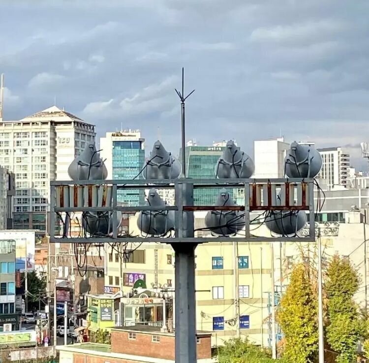 На самом деле это скворечник на столбе, который выглядит как дом, стоящий на краю белого здания на фоне 🏘️