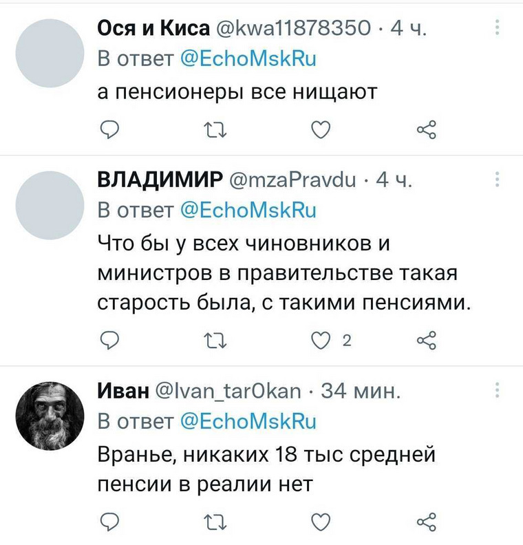 Интернет-пользователь под именем Владимир захотел чиновникам, включая министров, старости с такой пенсией, какую сейчас выдают многим старикам в России.