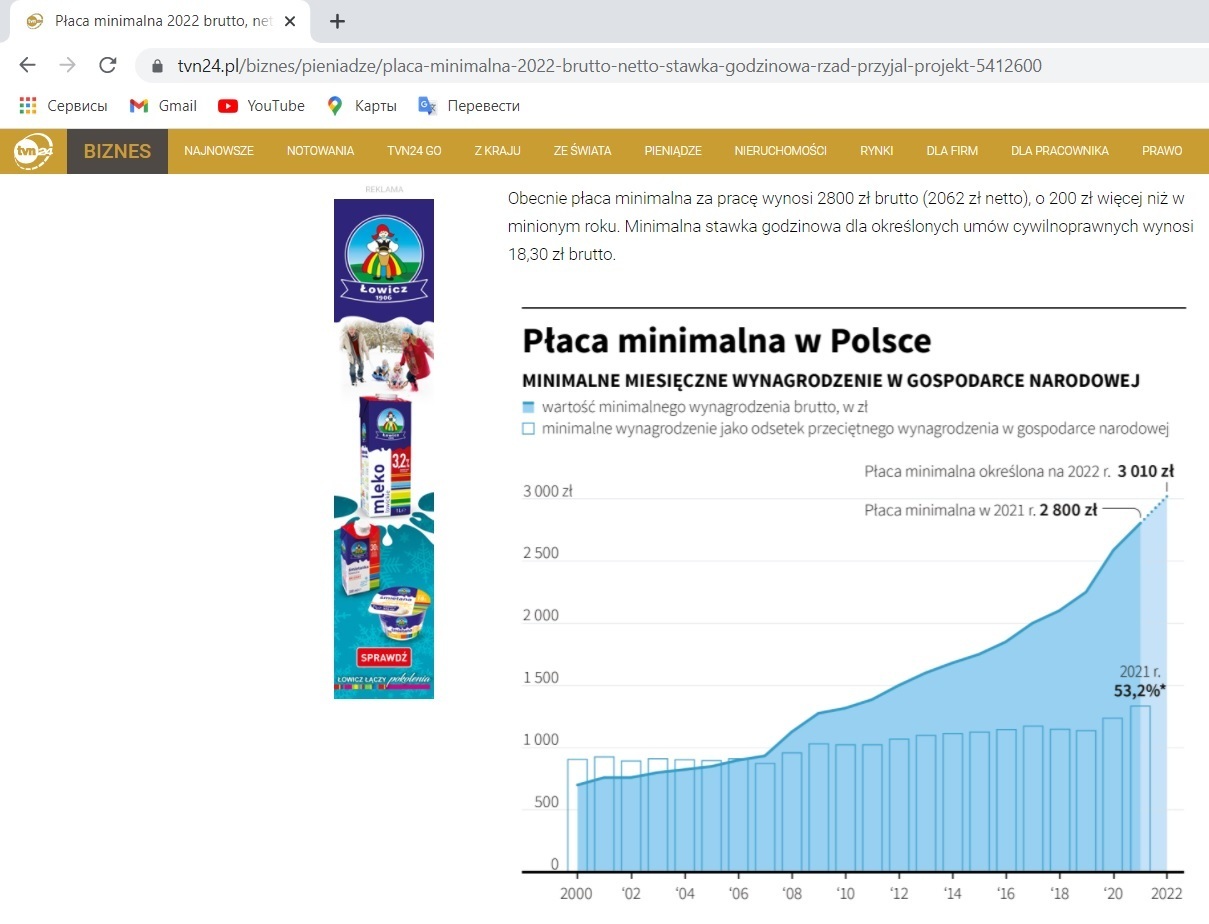 И тут я решил сравнить - сколько конкретно этого сыра может купить себе гражданин Польши на официальную минимальную месячную оплату труда в Польше, и сколько россиянин на нашу минимальную оплату труда? Погуглив ещё, удалось выяснить, что в 2021 году минимальная месячная оплата труда составляла 2800 злотых до налогообложения и 2062 злотых после (51 240 и 37 734,6 рублей соответственно).