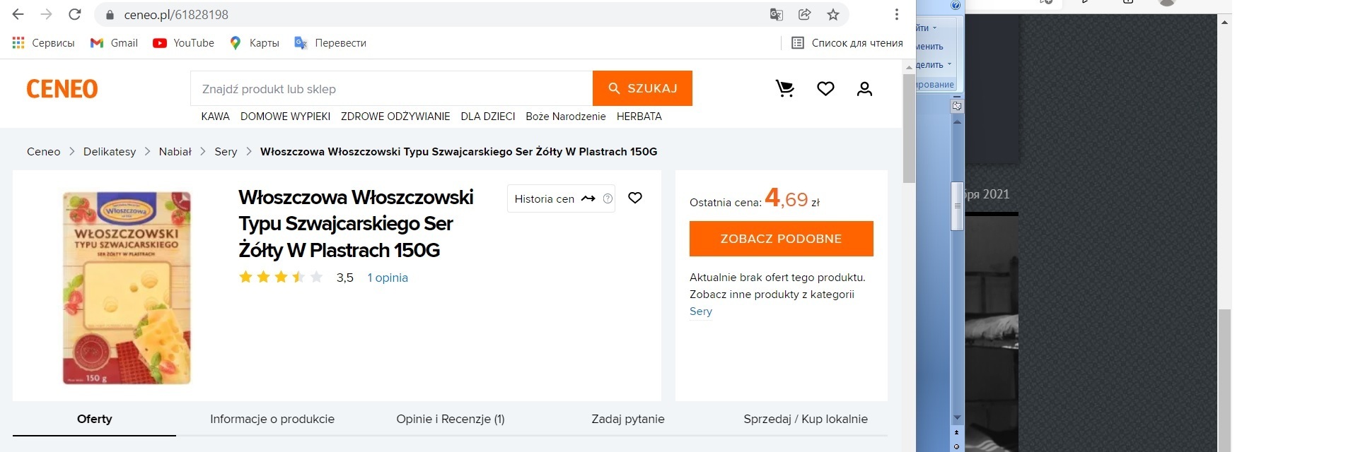 Привлекло же моё внимание то обстоятельство, что сыр именно польский, так сказать, из "загнивающей" Европы, и, при современных технологиях связи, то бишь интернете, пока его ещё у нас не отключили от мирового, можно достаточно легко узнать - а сколько же он собственно стоит в самой Польше? Немного погуглив (поисковик Яндекса не дал требуемых результатов, к сожалению, ничего личного) удалось выяснить, что цена такой упаковки в самой Польше составляет 4,69 злотых (85,83 рублей по курсу 18,3 рубля за 1 польский злотый на 31.12.21).