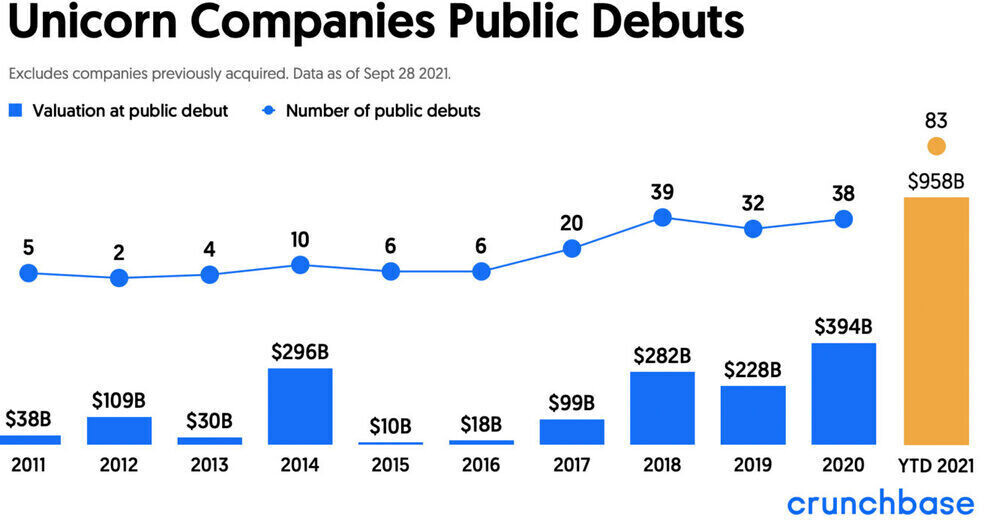 В 2021 году 83 компании-единорога, ставших публичными, совокупно оцениваются на IPO в чуть менее 1 триллиона долларов. Для сравнения в 2020 году таких компаний было 38 и их стоимость составляла $394 млрд, а в 2019 году 32 компании оценивались в $228 млрд.”