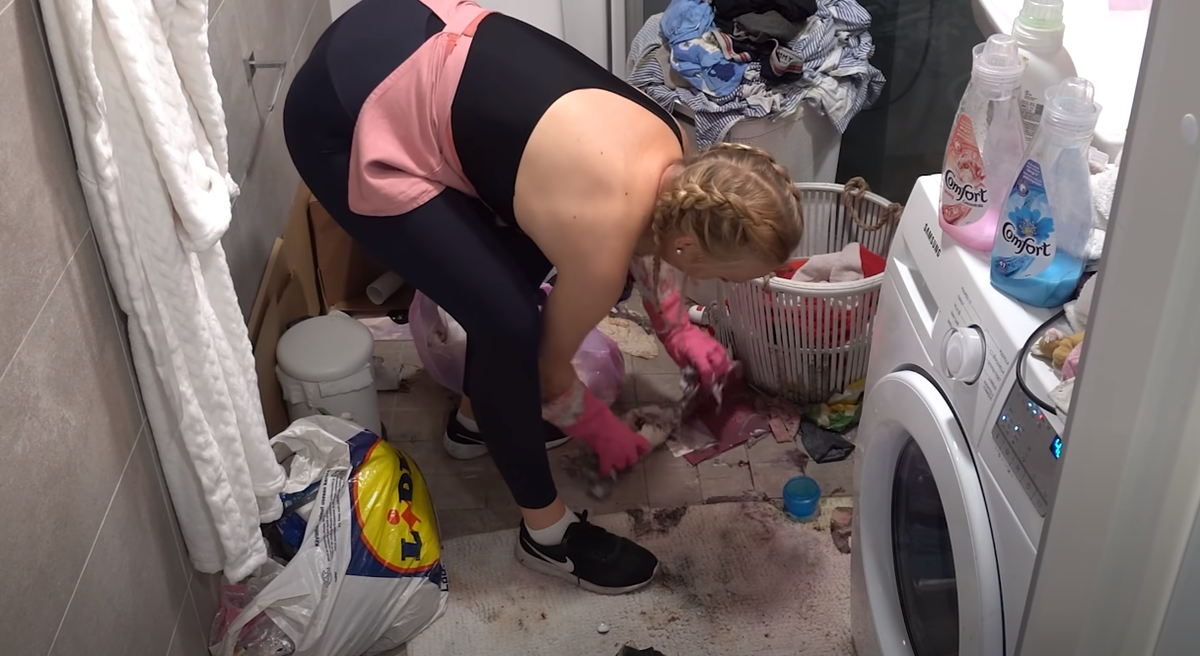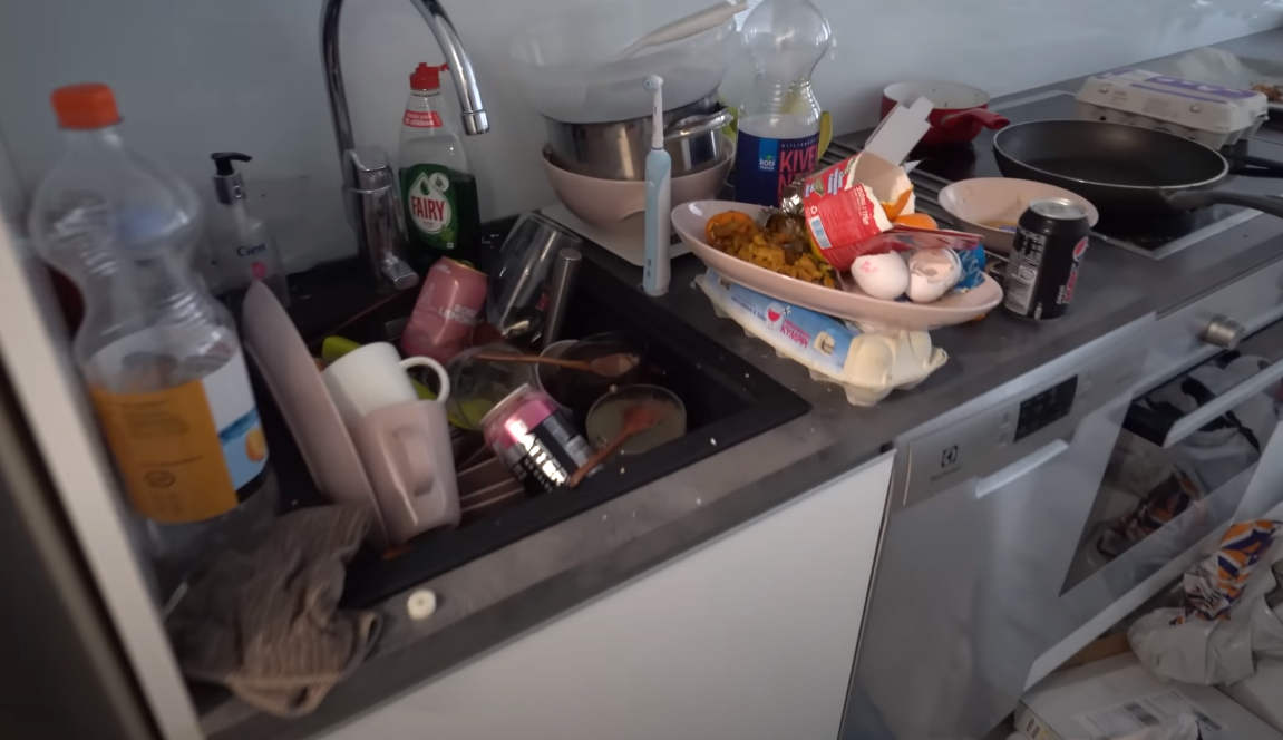 Просторная квартира с шикарным видом оказалось уничтоженной под большим слоем грязного белья, пакетов и бумажного мусора, валяющегося просто везде.
