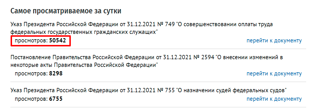 Аккурат под Новый год, 31 декабря Президент России сделал подарок повысил оклады и доплаты чиновникам. То, как этому рады сами чиновники, видно по статистике на сайте, где официально публикуются подписанные Президентом документы: