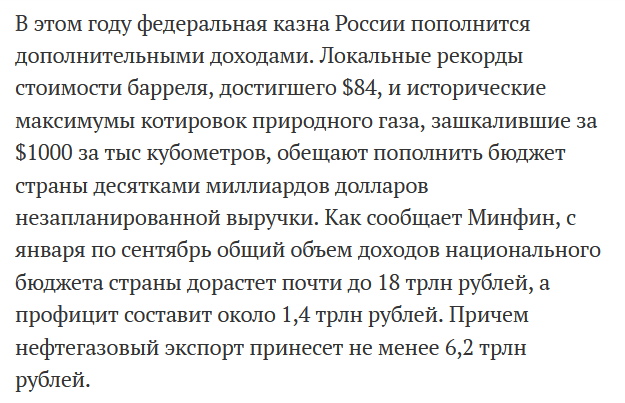 Как пишет издание МК, "постпандемийный 2021-й год оказался для российской казны неожиданно выигрышным". По прогнозам международных аналитических структур дополнительные доходы в бюджет страны могут превысить по итогам 2021-го года 50 миллиардов долларов.