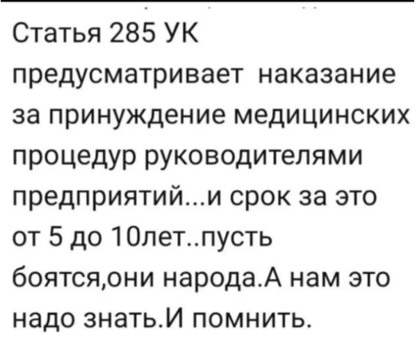 И еще: гораздо больше должны отвечать даже не те, кто вас заставляет, а те, кто вас пропагандирует ужалиться. Есть, знаете ли, такие личности, которые то ли от небольшого ума, то ли от вредности своего характера, но упорно заявляют, что только шмурдяк спасет нас всех от полного вымирания. Вот, эти деятели, как я считаю, гораздо больше повинны в смертях людей от отравленной ГМО-гадости. Вот они-то в первую очередь и должны отвечать за смерти и сломанные жизни оболваненных людей. Ну, Гинцбург должен висеть на вешалке - это само по себе понятно, в соответствии с Нюрнбергским Кодексом. Но и многочисленные его последователи и пособники тоже должны свою долю ответственности понести. Во имя Справедливости.