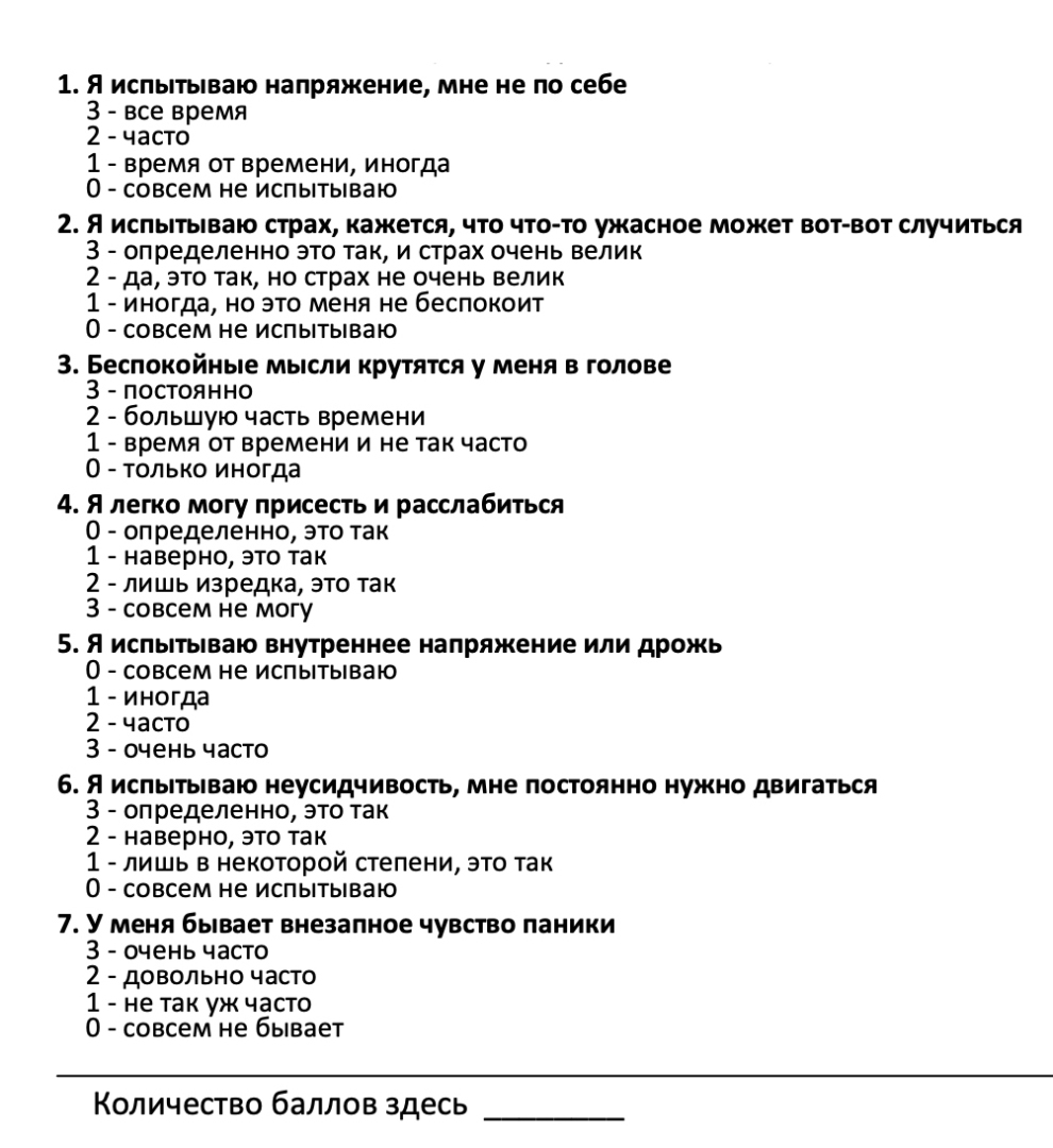 - Если у вас получилось от 0 до 7 баллов - это норма, у вас отсутствуют выраженные симптомы тревоги.