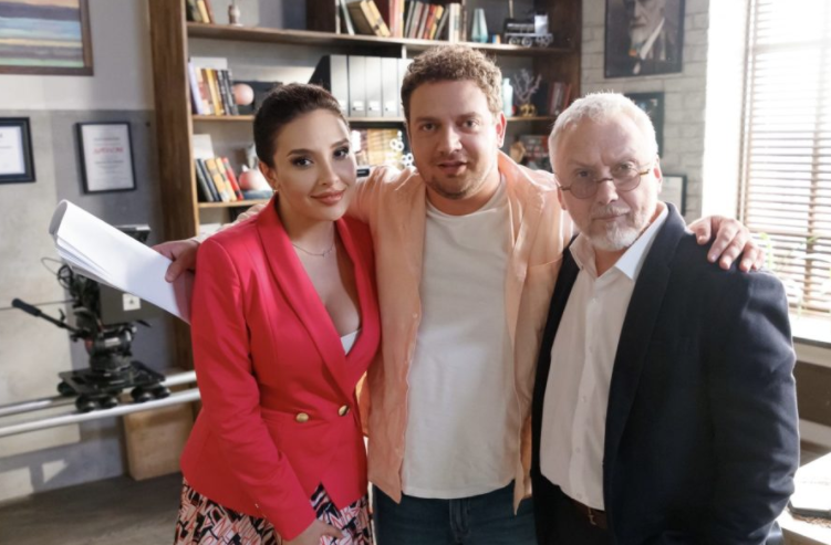 Ольга Дибцева, Борис Дергачёв и Вадим Демчог на съемках сериала «Семейка» (2022)