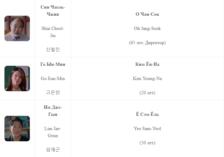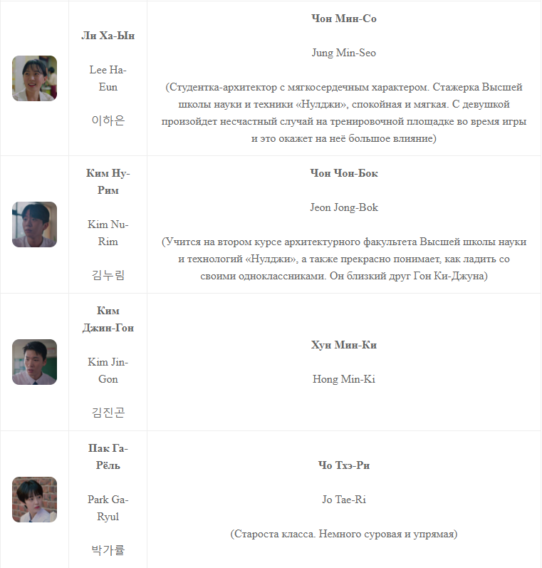 Ким Ё-Хан, Чо И-Хён, Чу Ён-У, Хван Бо-Рым-Бёль, Чон Сок-Хо, Ким Кан-Мин, Со Хи-Сон, Юн И-Рэ, Ли Сан-Джун, Ли Ха-Ын, Ким Ну-Рим, Ким Джин-Гон, Пак Га-Рёль, Чжон Е-Со, Ким Чха-Юн, Чха Чжу-Ван, Ким Кю-Сон, Ли Чжи-Ха, Ким Мин-Сан, Пак Гын-Рок, Син Чхоль-Чжин, Го Ын-Мин, Им Джэ-Гын, Пак Ин-Хван, Ким Су-Чжин, Чо Сын-Ён, Ким Йе-Чжи, Со Джэ-У, Чо Рён