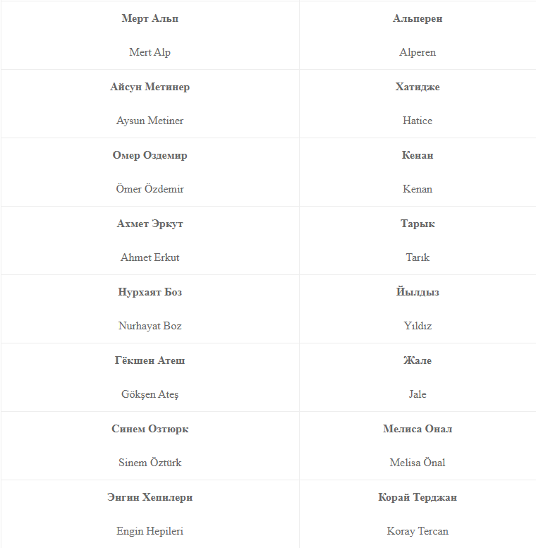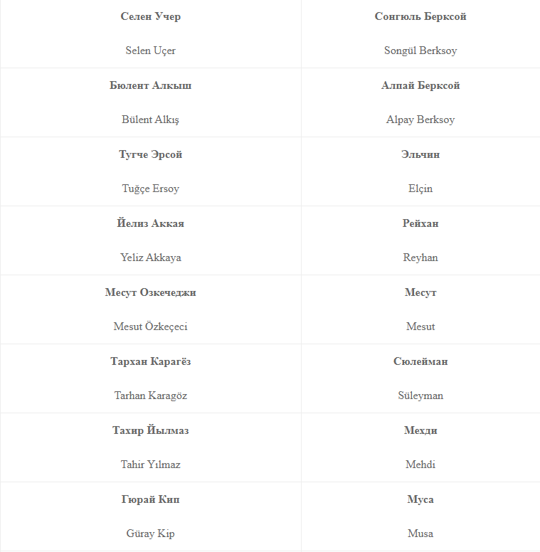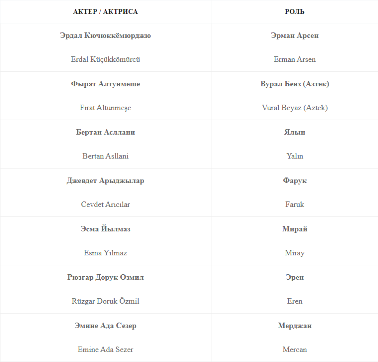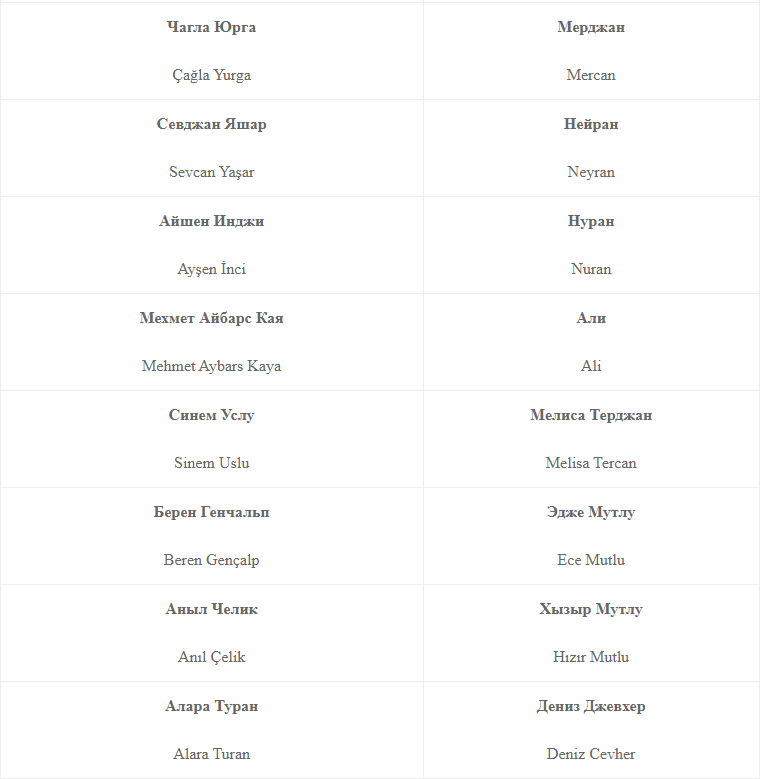 Гёкче Бахадыр, Сарп Аккая, Йигит Киразджы, Гёкче Эюбоглу, Тюлин Эдже, Сумру Явруджук, Эрдал Кючюккёмюрджю, Фырат Алтунмеше, Бертан Асллани, Эсма Йылмаз, Рюзгар Дорук Озмил, Эмине Ада Сезер, Мила Касарджы, Угур Сенкери, Гюлай Сютчю, Бурджу Сёйлер, Эда Ипек Санджак, Уфук Оздемир, Неслихан Йелдан, Селен Учер, Бюлент Алкыш, Тугче Эрсой, Алара Туран