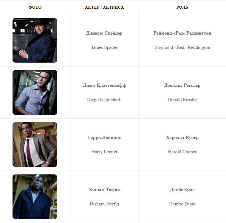 Роль загадочного, расчетливого и харизматичного преступника Рэймонда «Рэда» Реддингтона исполнил Джеймс Спэйдер. Лучшие работы актера – фильмы «Секс, ложь и видео» («Sex, Lies and Videotape»), «Белый дворец» («White Palace»), «Звездные врата» («Stargate»), «Волк» («Wolf»), «Мстители: Эра Альтрона» («Avengers: Age of Ultron»), а также сериал «Юристы Бостона» («Boston Legal»).
