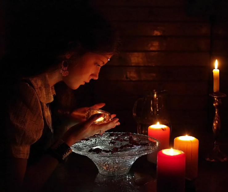 Ночью запри двери, выключи свет, поставь на стол 2 тарелки, а в каждую тарелку положи по кусочку ладана и зажги свечку.