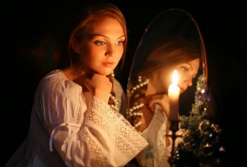 Девушка в 00.00 садится в темноте между двумя зеркалами, зажигает свечки и начинает вглядываться в "галерею отражений", надеясь увидеть своего суженого.